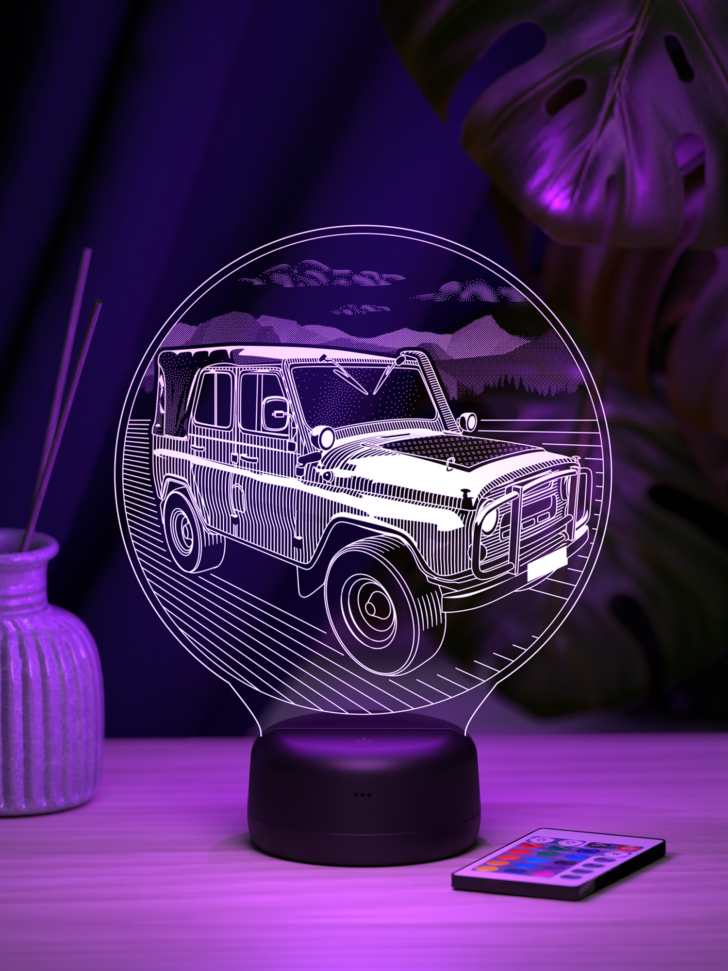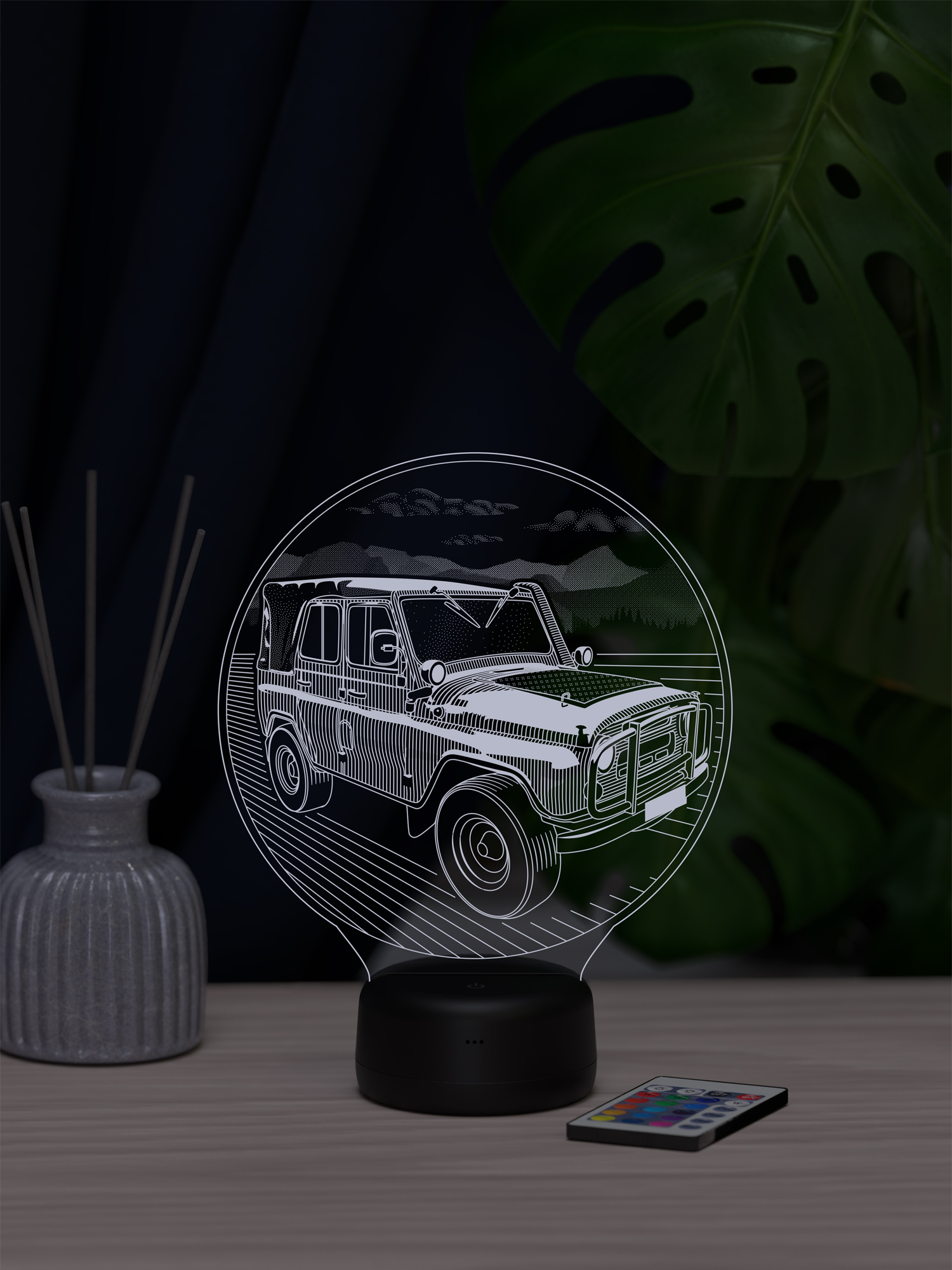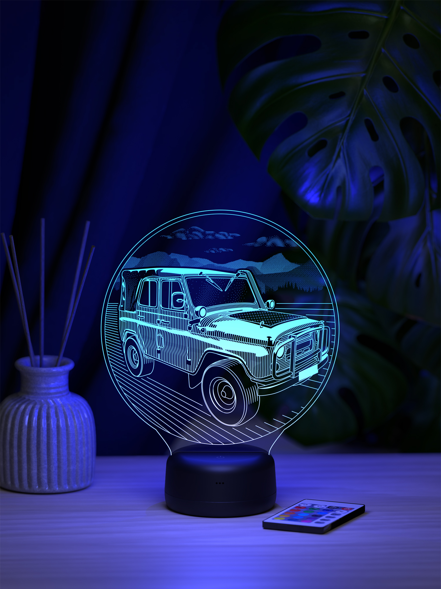 Ночник УАЗ 3151 - создан для тех, кто ощущает настоящую страсть к дороге, приключениям и легендарной технике. Силуэт мощного УАЗ 3151 будто оживает в мягком свете, создавая атмосферу свободы, путешествий и духа бездорожья. Его свечение напоминает о сильных эмоциях и звуках двигателя, превращая обычное освещение в элемент настроения и вдохновения. Такой ночник станет эффектным украшением интерьера и подчеркнёт характер своего владельца.