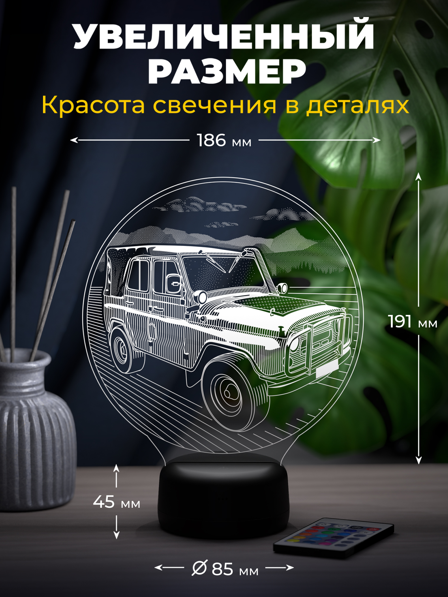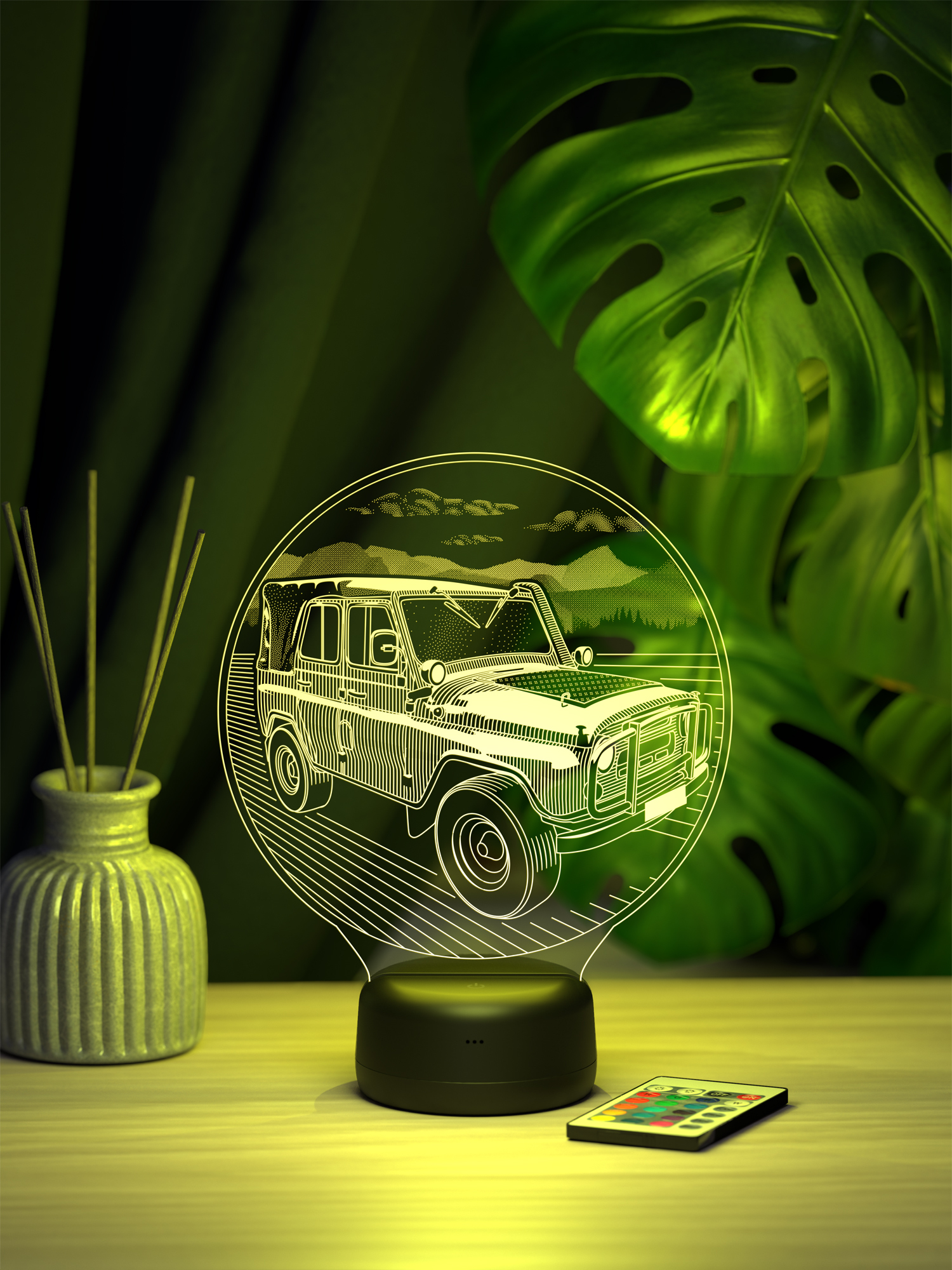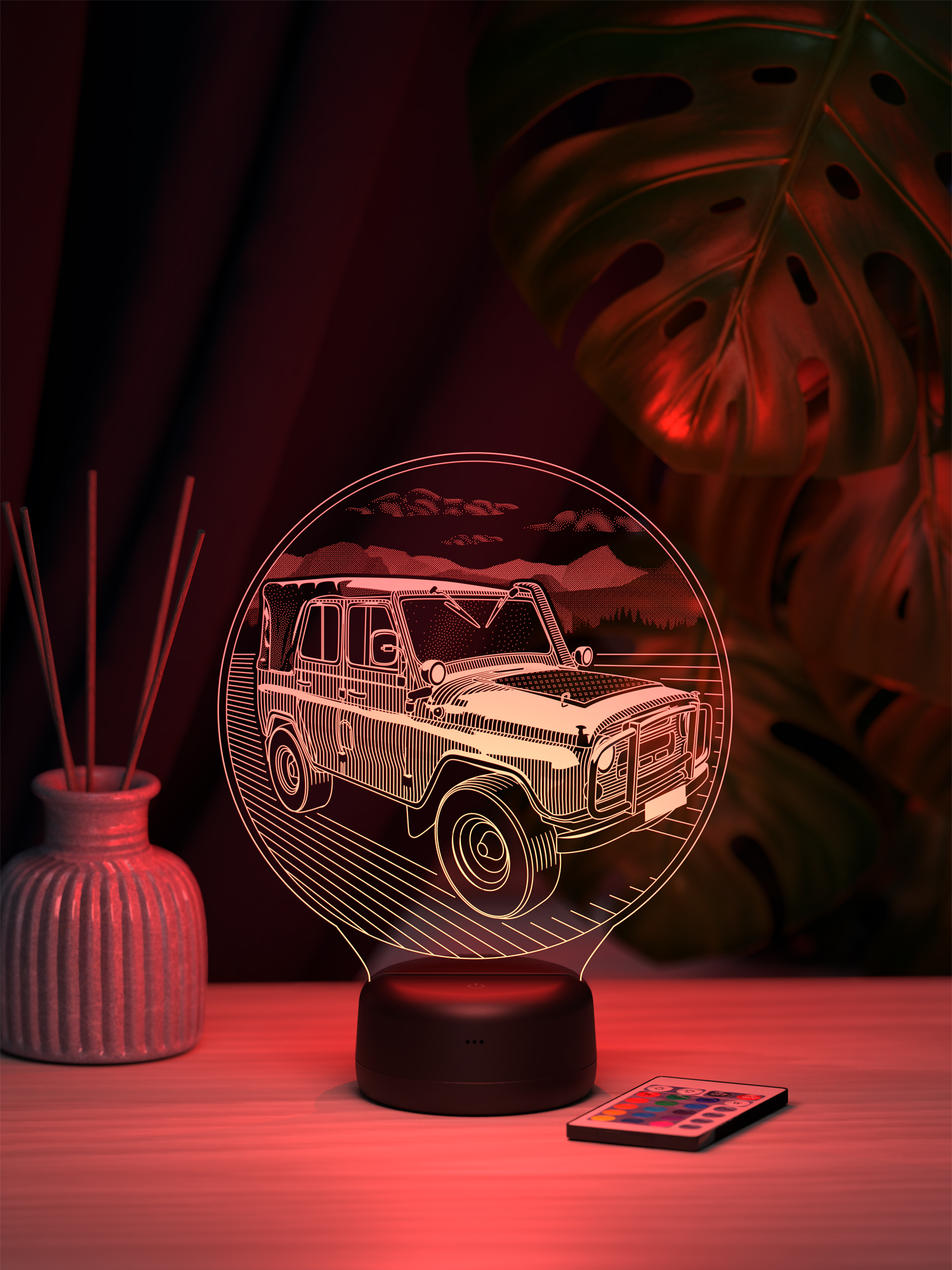 Ночник УАЗ 3151 - создан для тех, кто ощущает настоящую страсть к дороге, приключениям и легендарной технике. Силуэт мощного УАЗ 3151 будто оживает в мягком свете, создавая атмосферу свободы, путешествий и духа бездорожья. Его свечение напоминает о сильных эмоциях и звуках двигателя, превращая обычное освещение в элемент настроения и вдохновения. Такой ночник станет эффектным украшением интерьера и подчеркнёт характер своего владельца.