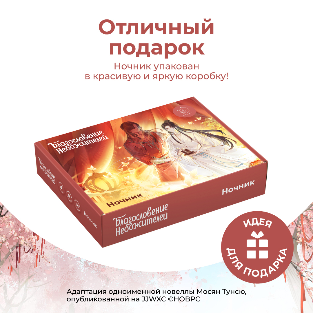 Официальная лицензионная продукция "Благословение небожителей" Товар сертифицирован. Ночник "Благословение небожителей" - отличная идея для индивидуального подарка! В светильнике 16 цветов свечения, регулировка уровня яркости и 4 режима переливания цвета. Управление режимами свечения осуществляется с помощью пульта дистанционного управления, а также прикосновением к сенсорной панели на основании светильника. Для подключения светильника используйте USB-адаптер 5V или 3 батарейки АА. В комплекте USB-кабель. Ночник упакован в брендированную подарочную упаковку - идеально для подарка. Безопасен для детей. Отсутствие нагрева корпуса и картинки.