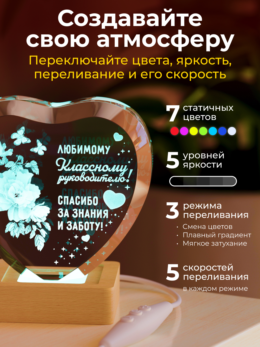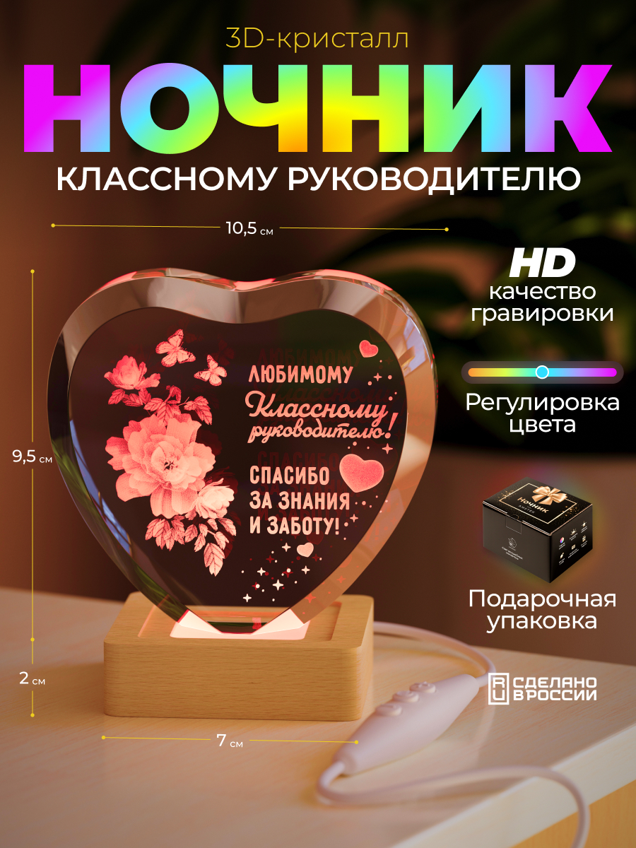 Представляем вам очаровательный 3D кристалл "Сердце классному руководителю" от Amstek – это не просто ночник, а настоящий символ любви и заботы. Этот изящный кристалл с гравировкой станет прекрасным подарком для учителя на день рождения, 8 марта или выпускной. Представьте, как его мягкий, разноцветный свет создаст уютную атмосферу в спальне, кабинете или любой другой комнате, наполняя ее теплом и уютом. Этот интерьерный ночник станет прекрасным декором для комнаты, а его волшебный дизайн с цветами непременно вызовет улыбку на лице. В комплект входит все необходимое: световая база с USB проводом, салфетка для ухода и подарочная упаковка, что делает его идеальным презентом. Подарите учителю частичку тепла и света с этим чудесным 3D кристаллом!