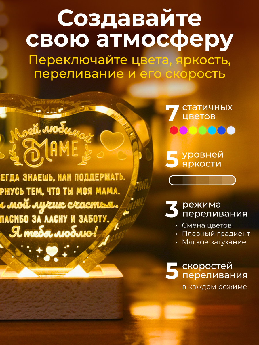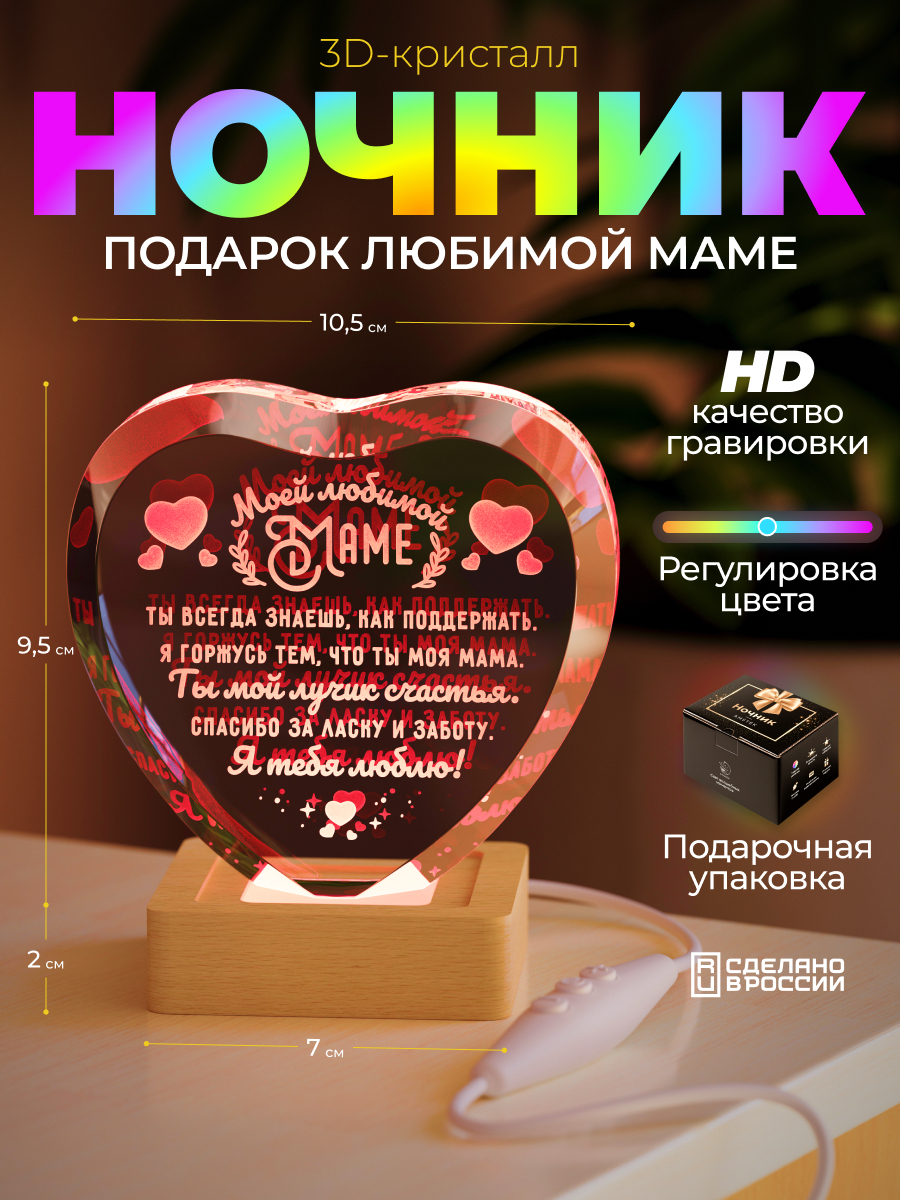 Представляем вам очаровательный 3D кристалл "Сердце любимой маме" от Amstek – это не просто ночник, а настоящий символ любви и заботы. Этот изящный кристалл с гравировкой станет прекрасным подарком для бабушки на день рождения, 8 марта или просто так, без повода. Представьте, как его мягкий, разноцветный свет создаст уютную атмосферу в спальне, кабинете или любой другой комнате, наполняя ее теплом и уютом. Этот интерьерный ночник станет прекрасным декором для комнаты, а его волшебный дизайн с цветами непременно вызовет улыбку на лице вашей бабушки. В комплект входит все необходимое: световая база с USB проводом, салфетка для ухода и подарочная упаковка, что делает его идеальным презентом. Подарите бабушке частичку тепла и света с этим чудесным 3D кристаллом!