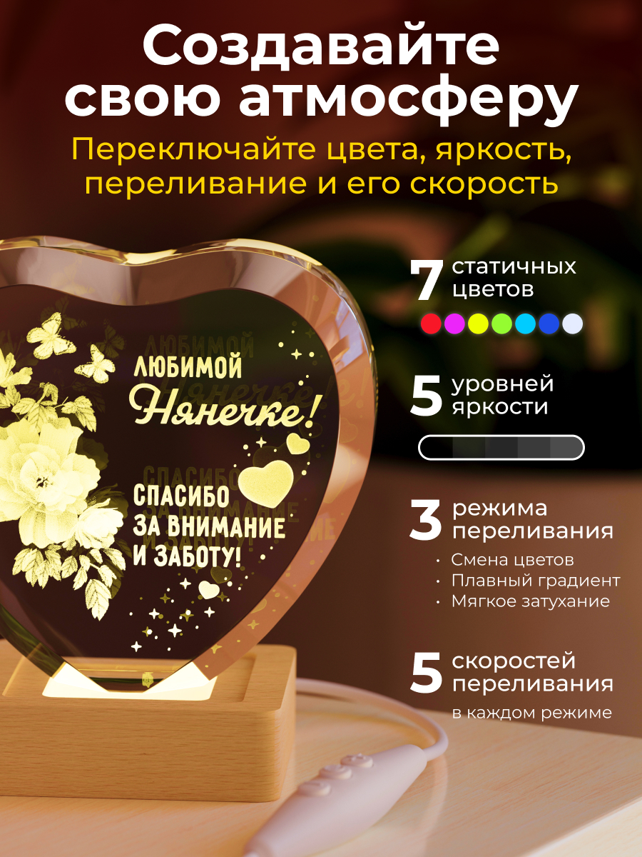 Представляем вам очаровательный 3D кристалл "Сердце нянечке" от Amstek – это не просто ночник, а настоящий символ любви и заботы. Этот изящный кристалл с гравировкой станет прекрасным подарком для учителя на день рождения, 8 марта или выпускной. Представьте, как его мягкий, разноцветный свет создаст уютную атмосферу в спальне, кабинете или любой другой комнате, наполняя ее теплом и уютом. Этот интерьерный ночник станет прекрасным декором для комнаты, а его волшебный дизайн с цветами непременно вызовет улыбку на лице. В комплект входит все необходимое: световая база с USB проводом, салфетка для ухода и подарочная упаковка, что делает его идеальным презентом. Подарите учителю частичку тепла и света с этим чудесным 3D кристаллом!
