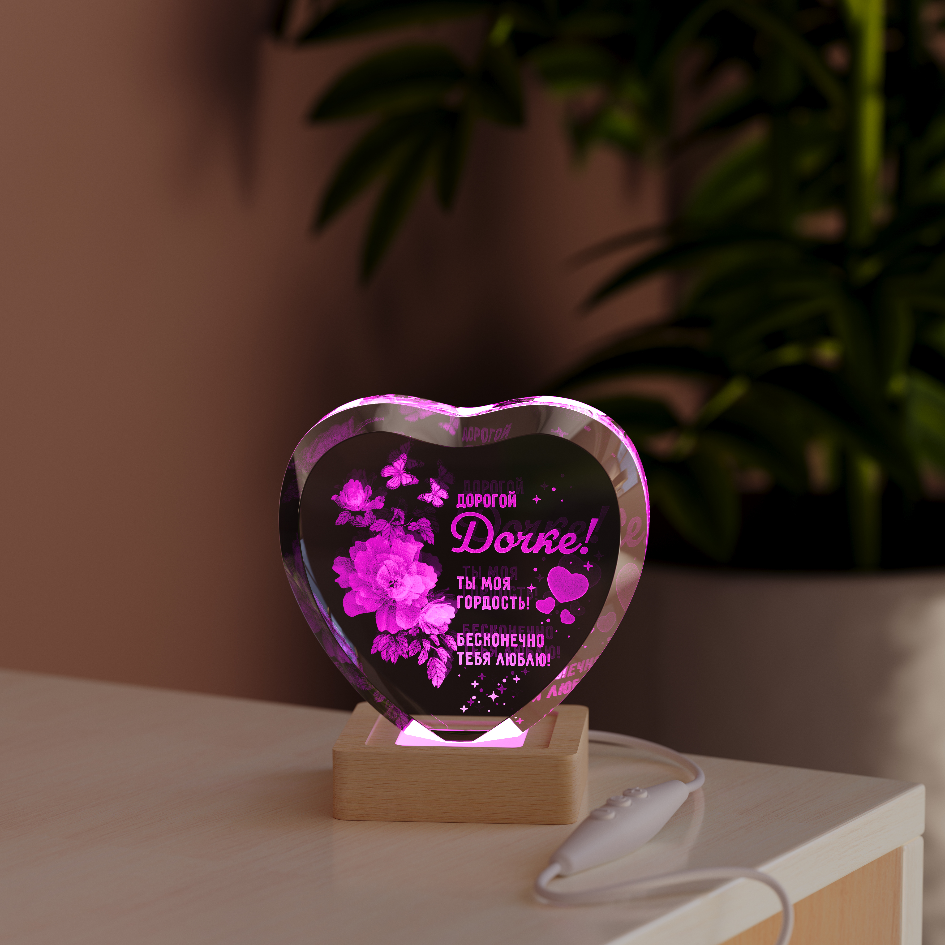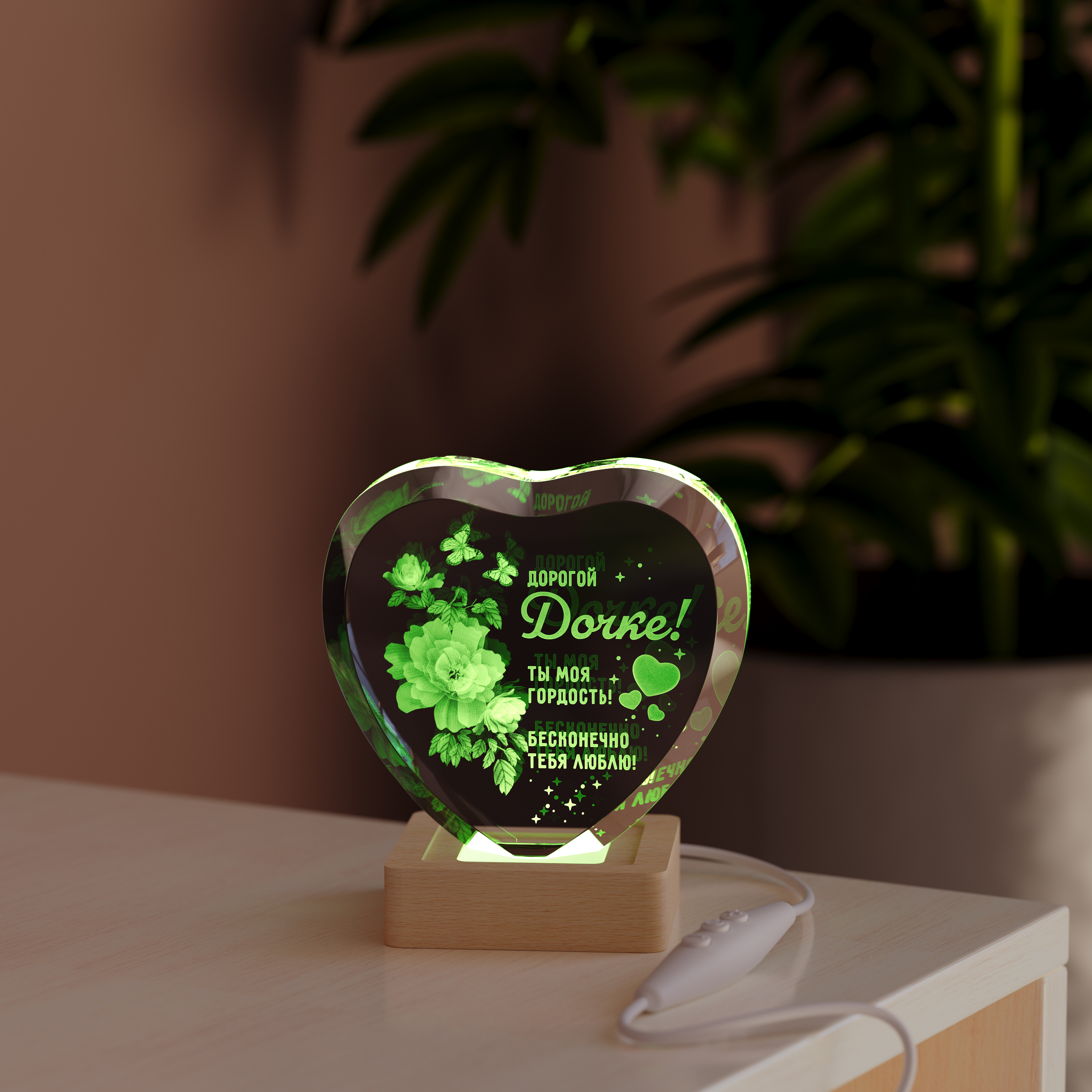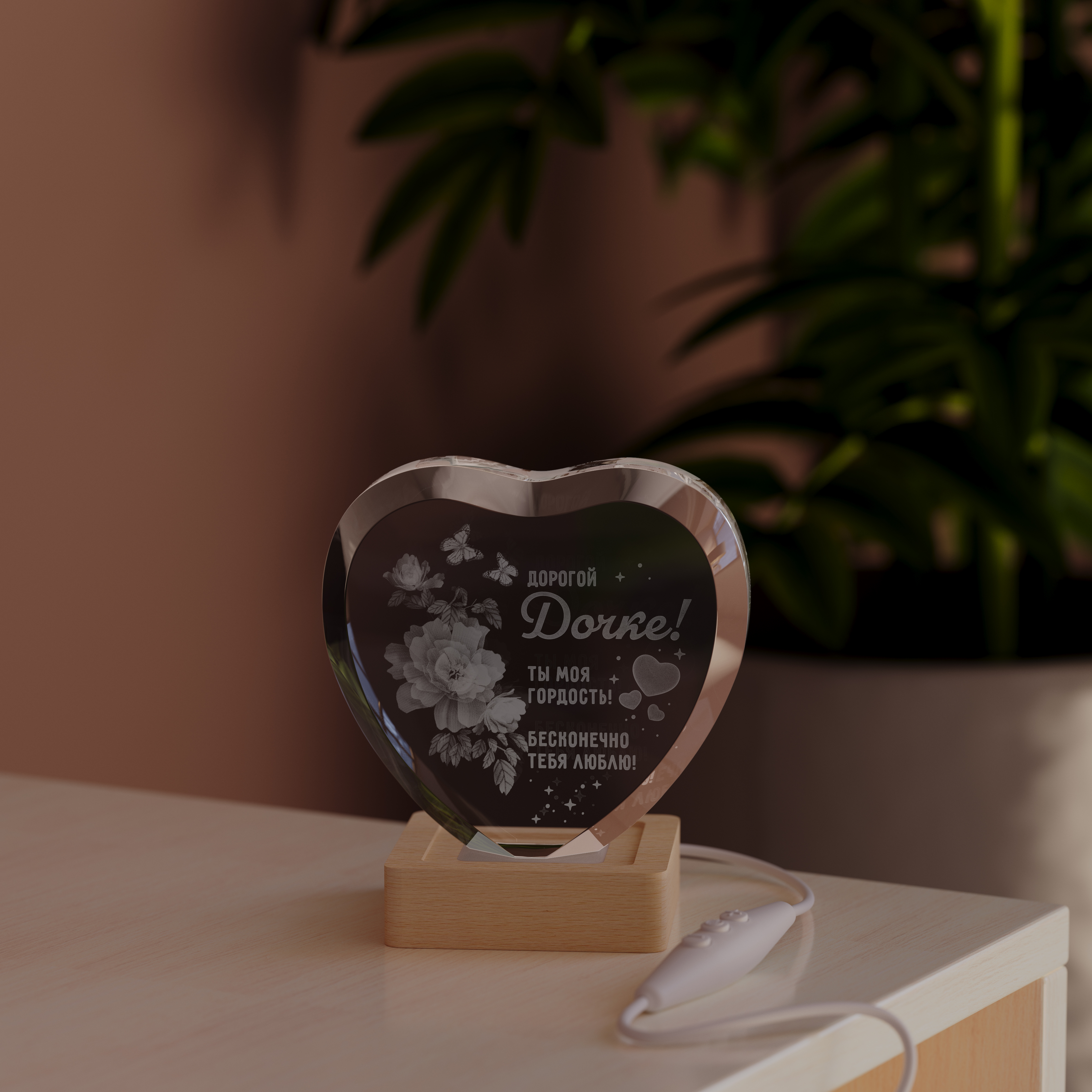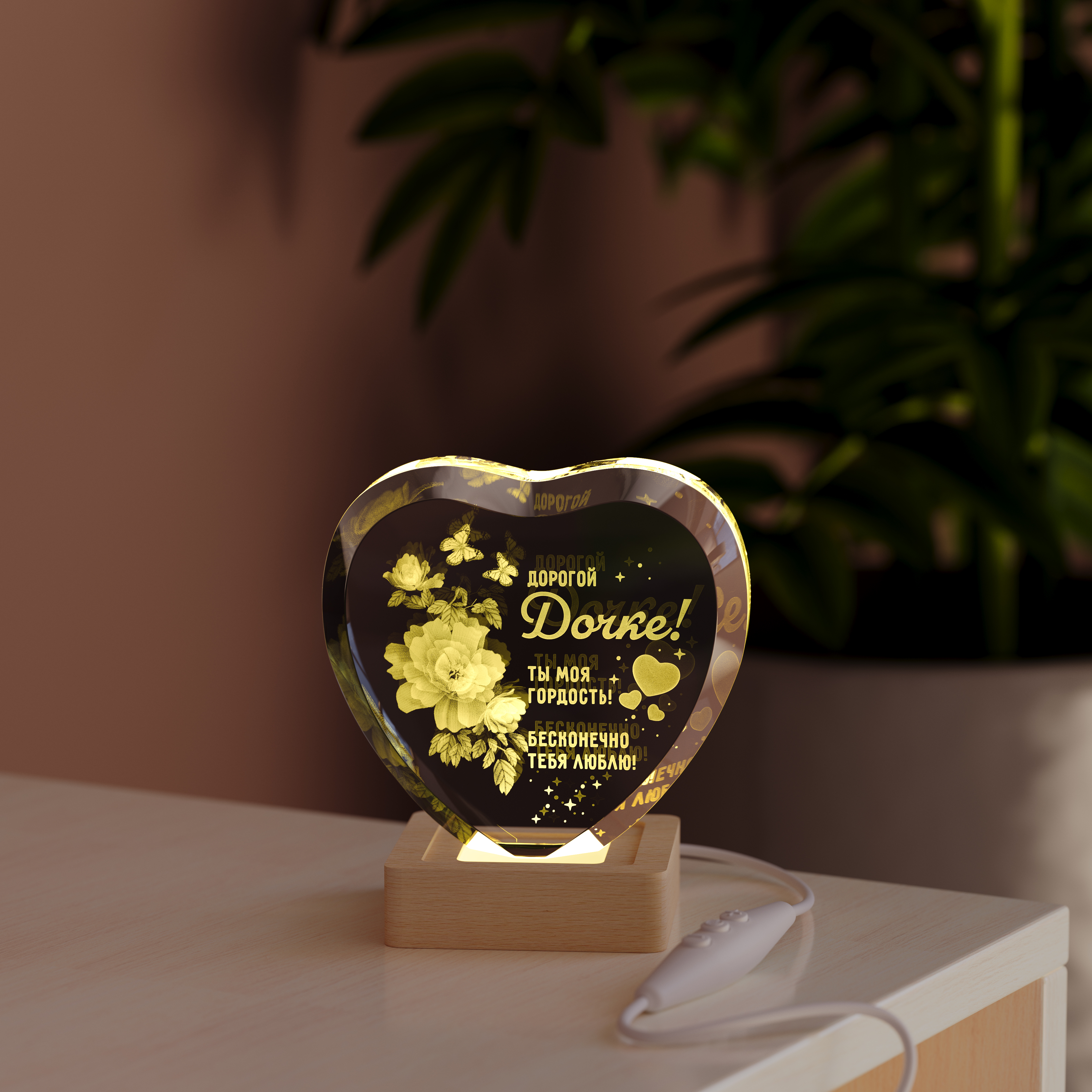 Ночник Сердце с цветами дочке создан для того, чтобы стать тёплым символом ваших чувств. Изящное изображение сердца в окружении нежных цветов говорит о восхищении и заботе, напоминая о том, какой прекрасной она выросла.