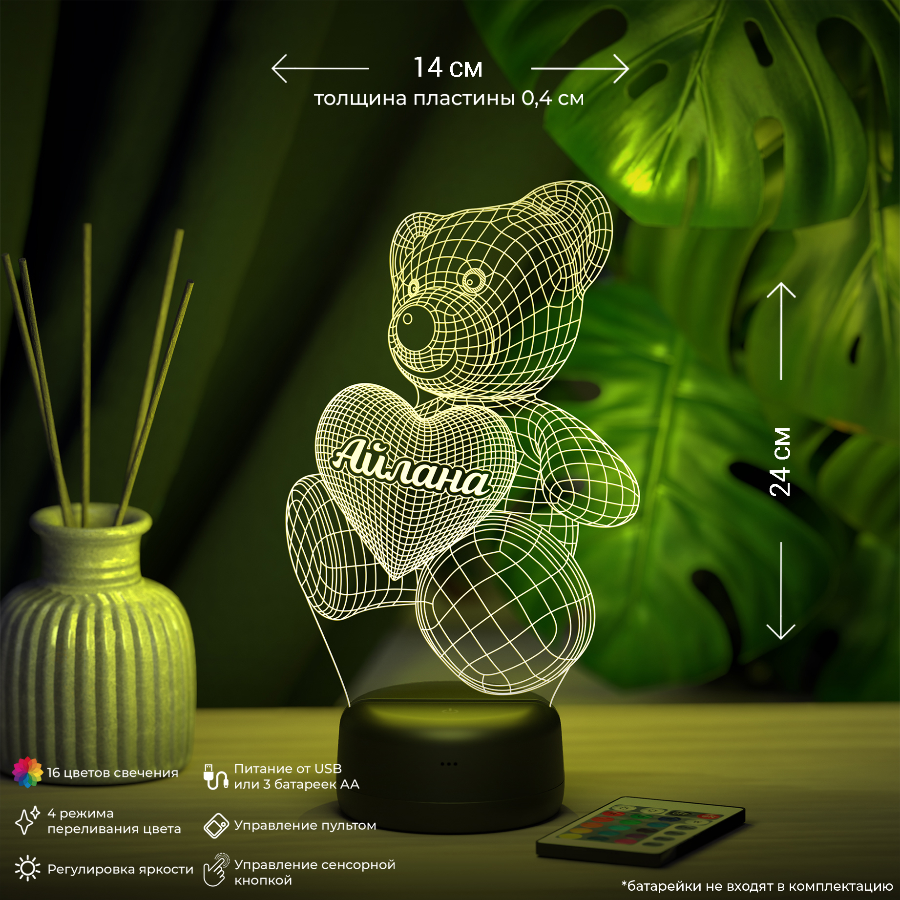 В светильнике 16 цветов свечения и режим плавной смены цвета. Цвета переключаются сенсорной кнопкой. Сенсорный выключатель находится в верхней части подставки. Радиус освещения в пределах 2-х метров. Размеры: Высота(вместе с подставкой): 22 см. Ширина: 16 см. Материал: -органическое стекло -база из ABS пластика