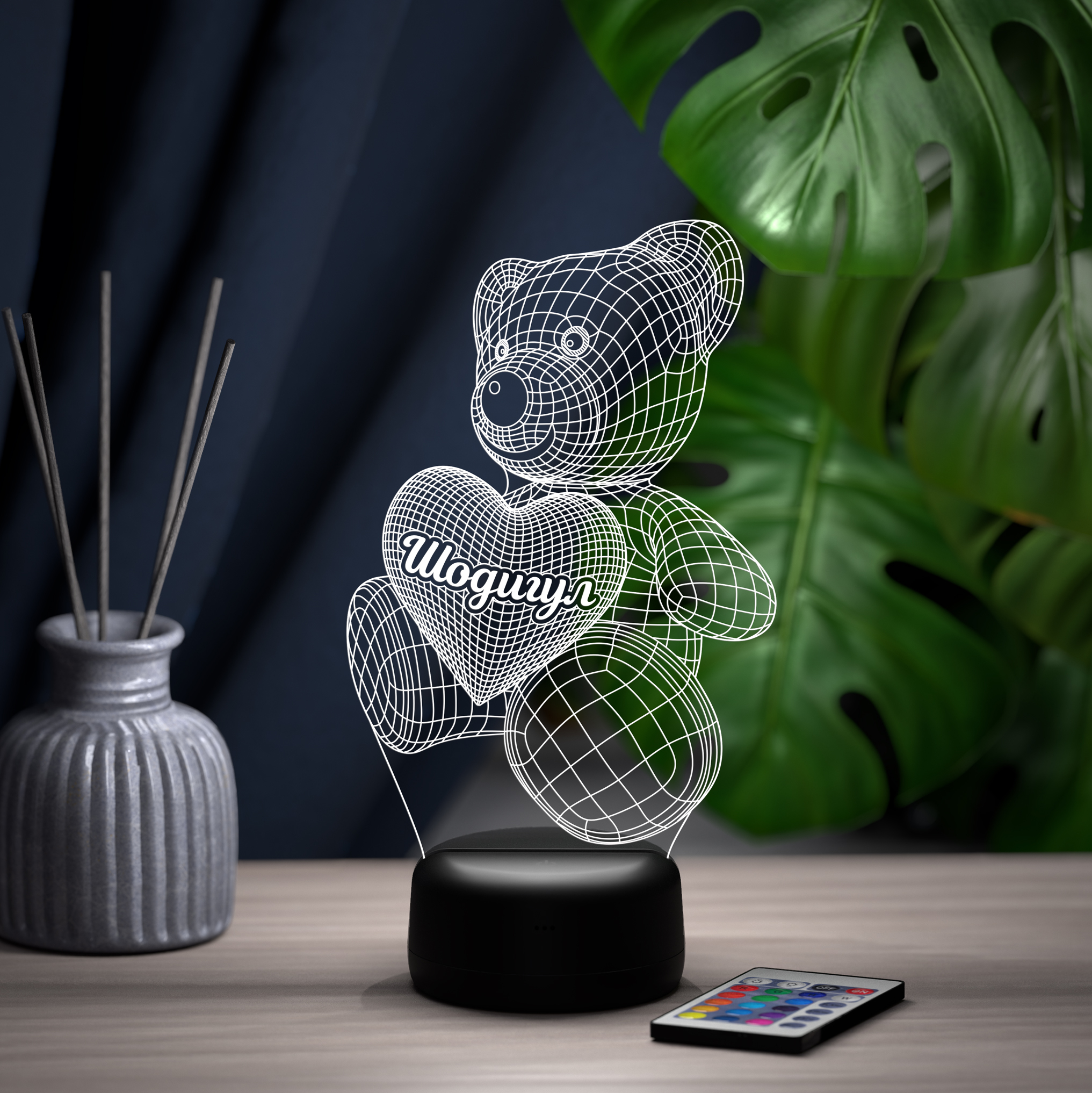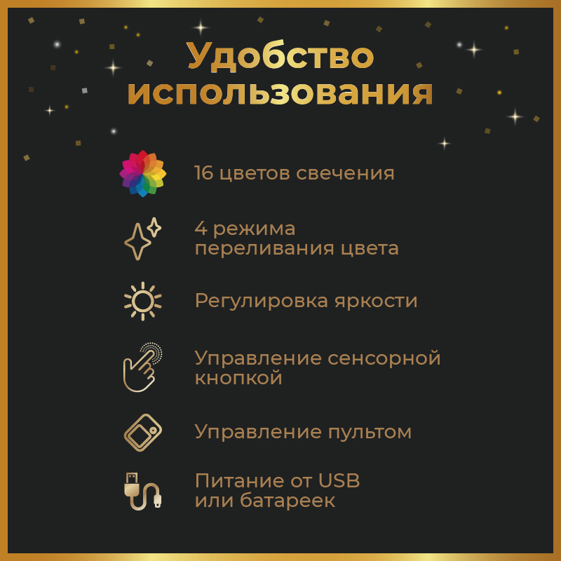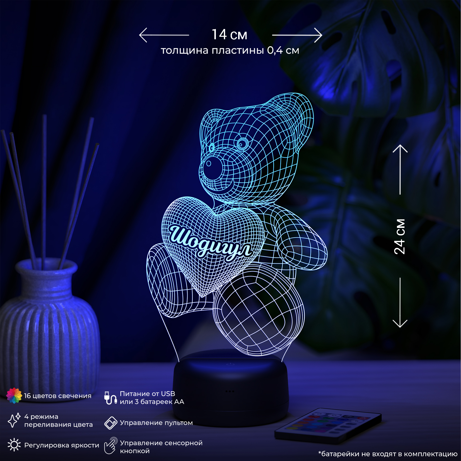 В светильнике 16 цветов свечения и режим плавной смены цвета. Цвета переключаются сенсорной кнопкой. Сенсорный выключатель находится в верхней части подставки. Радиус освещения в пределах 2-х метров. Материал: -органическое стекло -база из ABS пластика