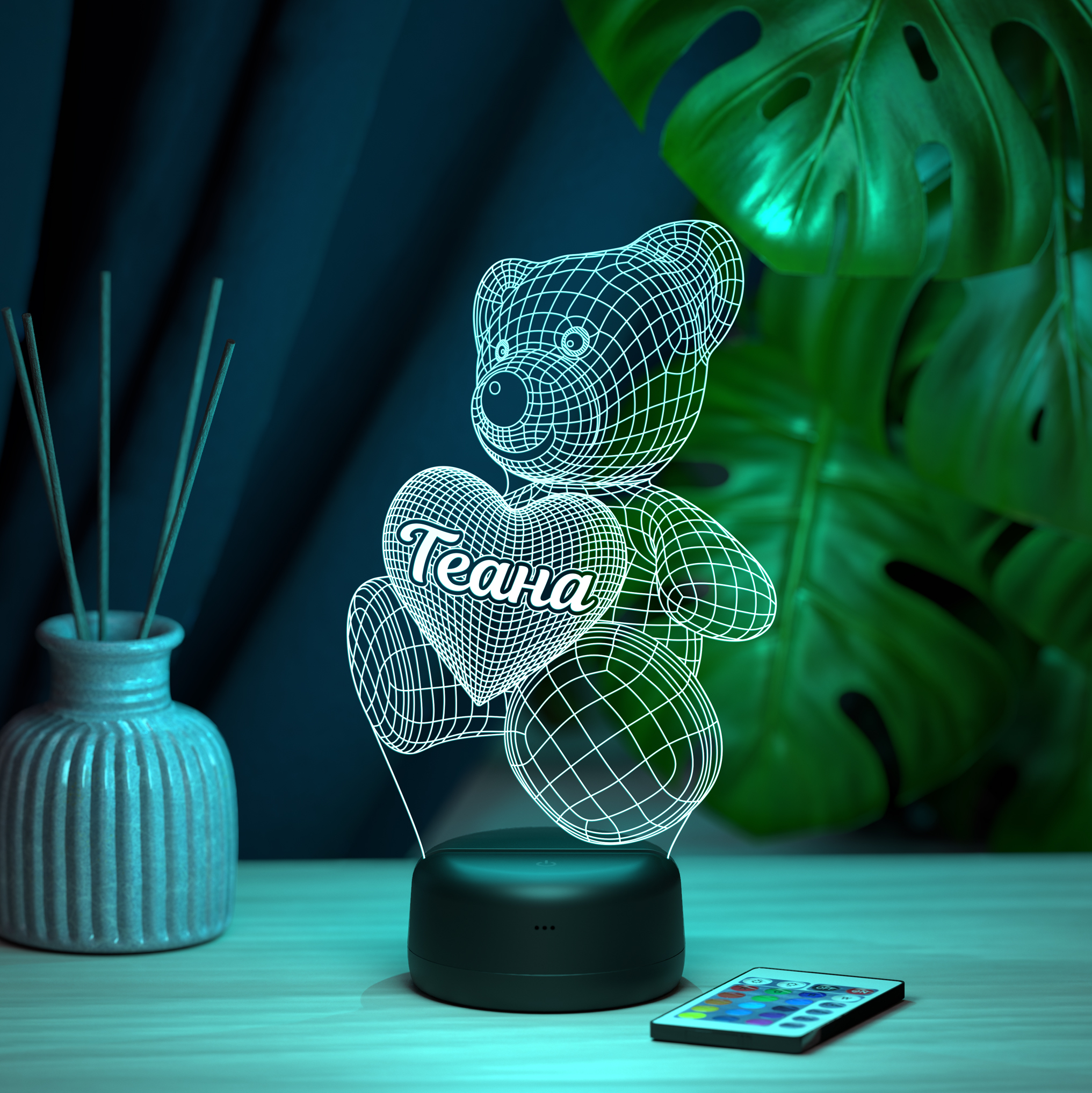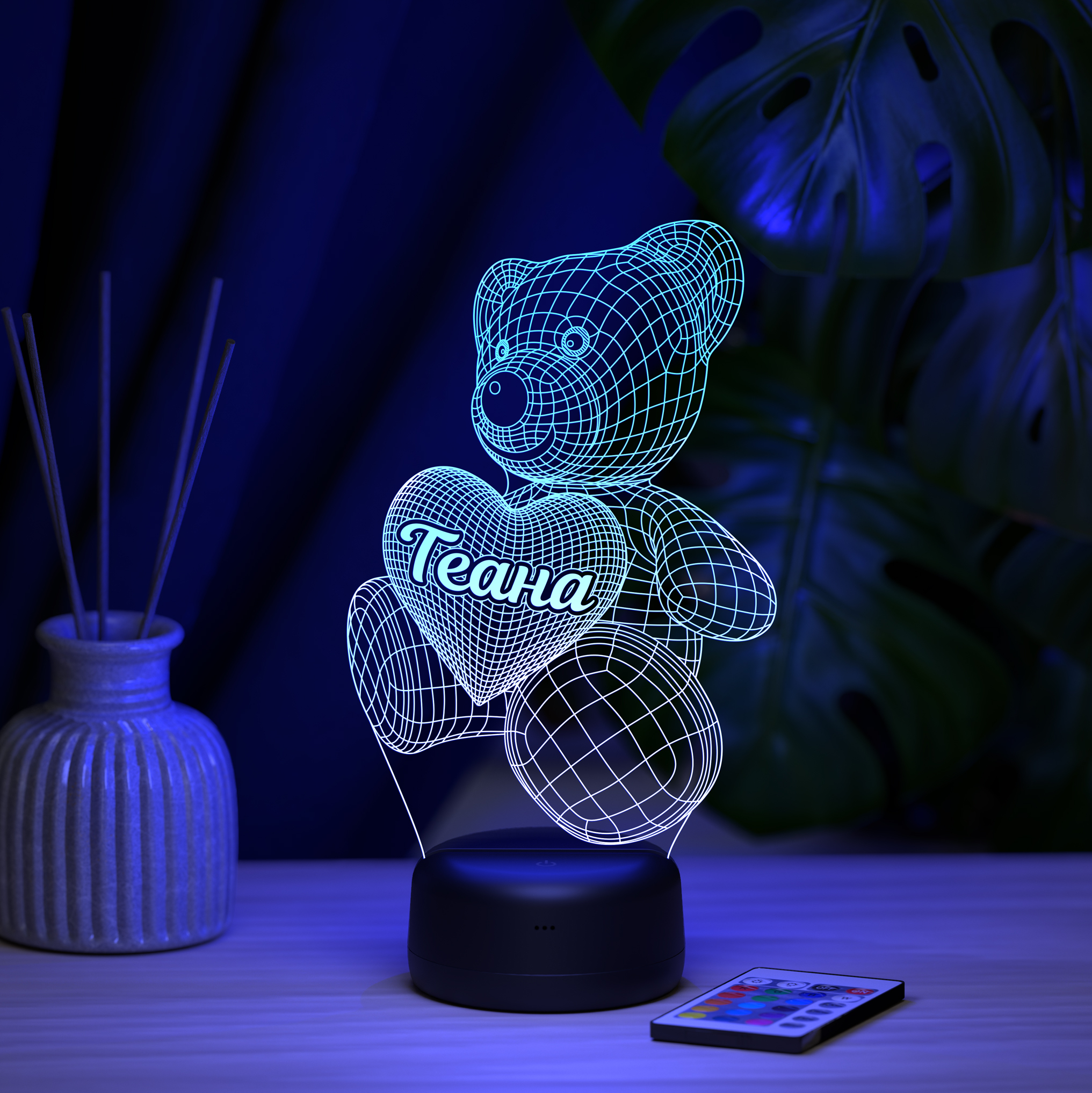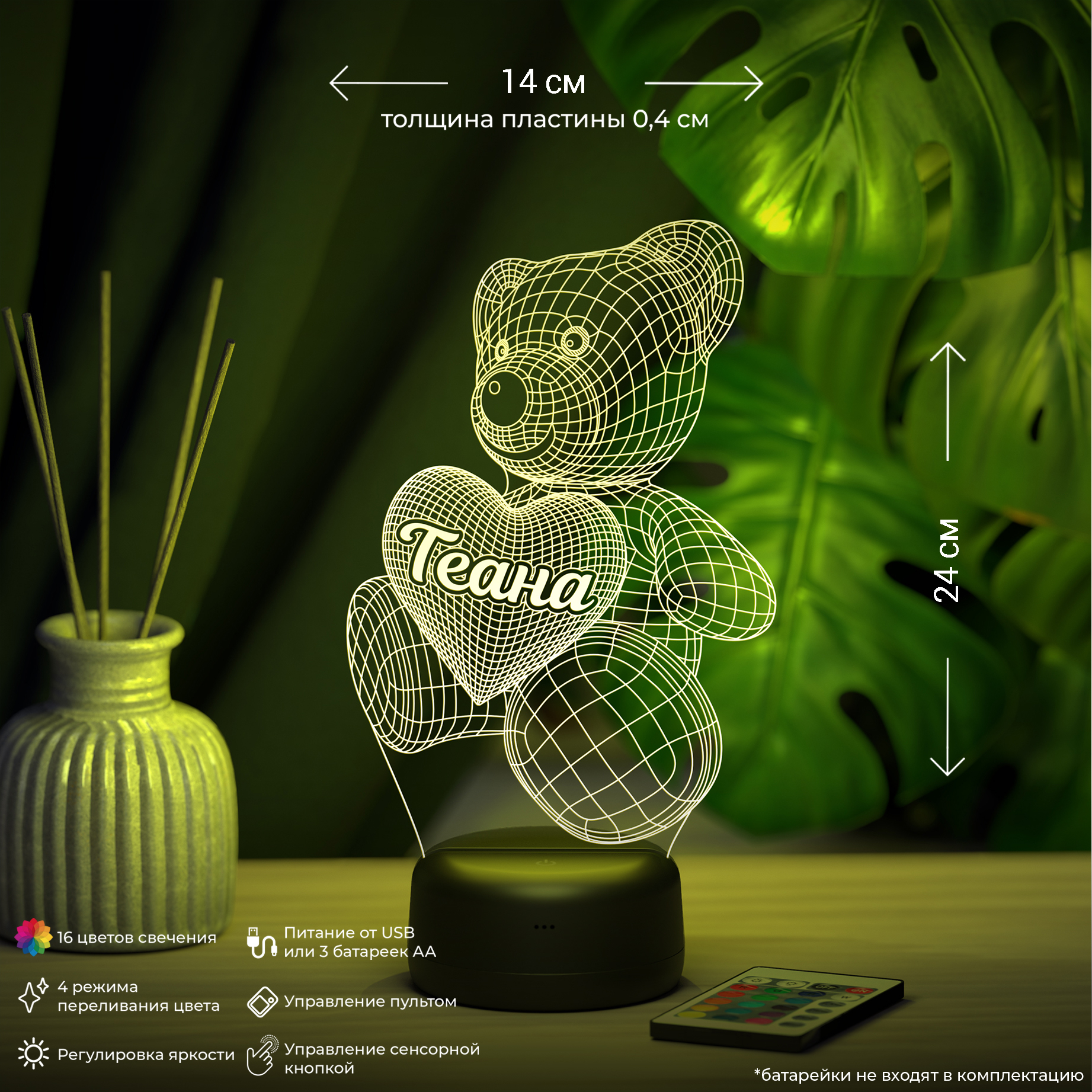 В светильнике 16 цветов свечения и режим плавной смены цвета. Цвета переключаются сенсорной кнопкой. Сенсорный выключатель находится в верхней части подставки. Радиус освещения в пределах 2-х метров. Материал: -органическое стекло -база из ABS пластика