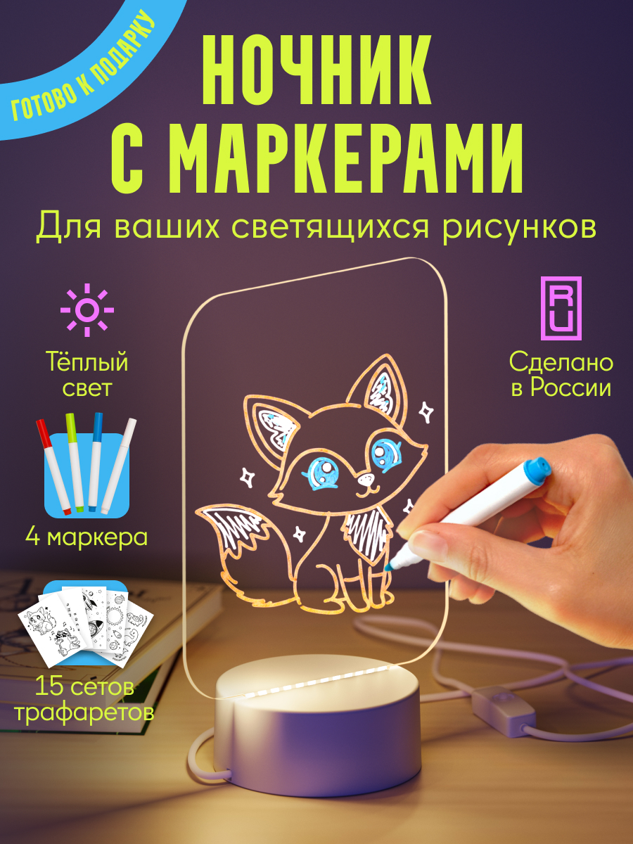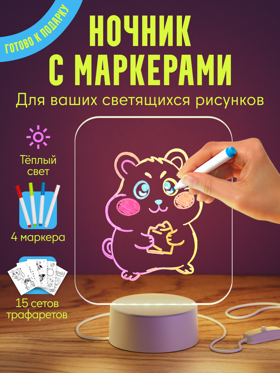 Ночник оснащён 16 цветами свечения, регулировкой яркости и возможностью переключения оттенков с помощью пульта дистанционного управления. Высокое качество материалов делает его долговечным, а презентабельная упаковка позволяет подарить его с удовольствием и без лишних забот. Мягкое свечение превращает пространство в место, где царят вдохновение и светлая фантазия. Каждый рисунок на поверхности ночника становится частью интерьера и переносит вас в атмосферу гармонии, света и творчества.