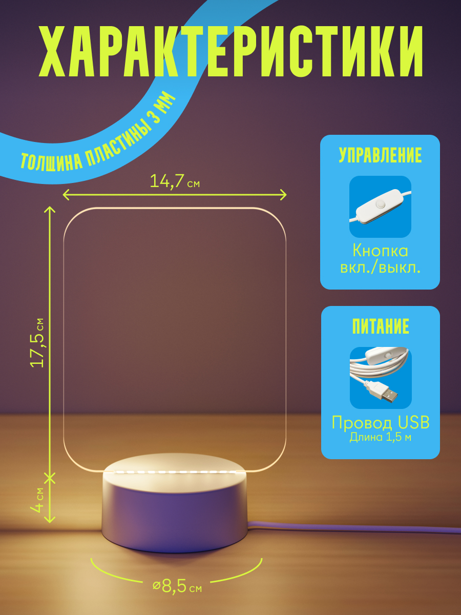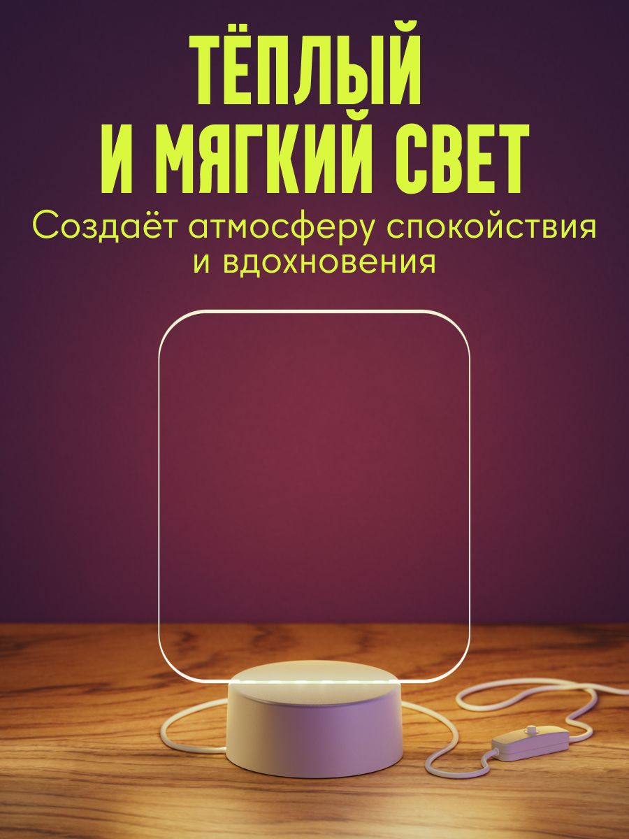 Ночник Прямоугольник - это источник света, творчества и вдохновения, который наполняет пространство уютом и мягкой атмосферой. Его аккуратная прямоугольная форма помогает создать гармонию в интерьере, а свечение придаёт комнате тёплое настроение и ощущение спокойствия. На прозрачной поверхности можно рисовать фломастерами или оставлять заметки - каждый штрих превращается в отражение эмоций, идей и фантазий. Свет подчёркивает рисунки и делает их частью волшебного процесса, когда обычный вечер становится творческим ритуалом, а свечение рождает вдохновение.
