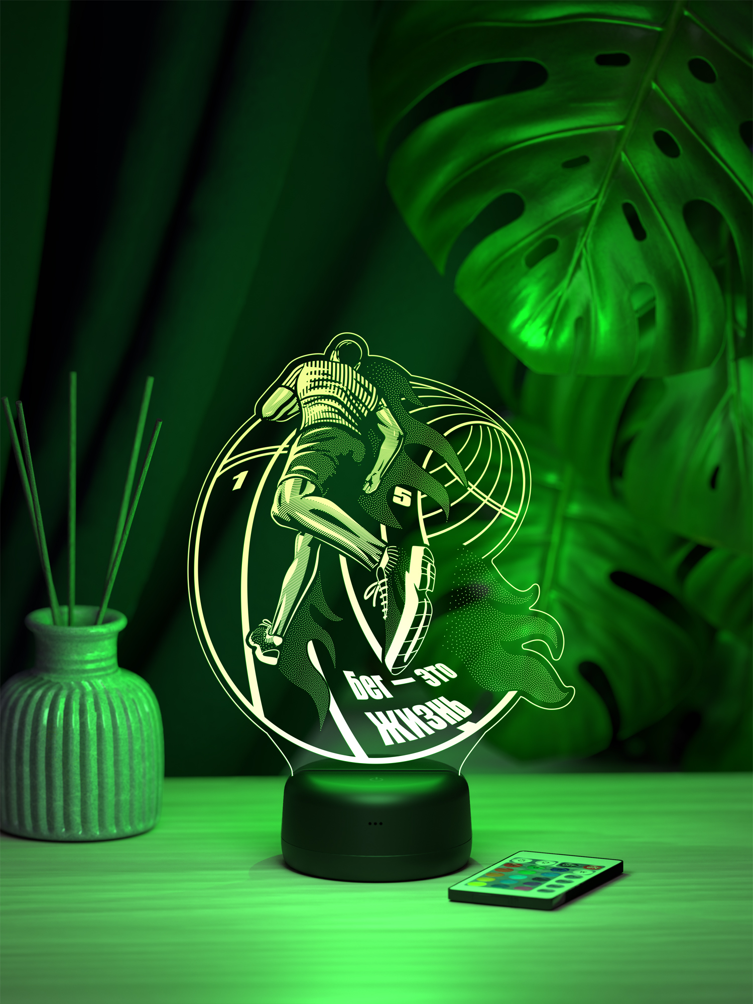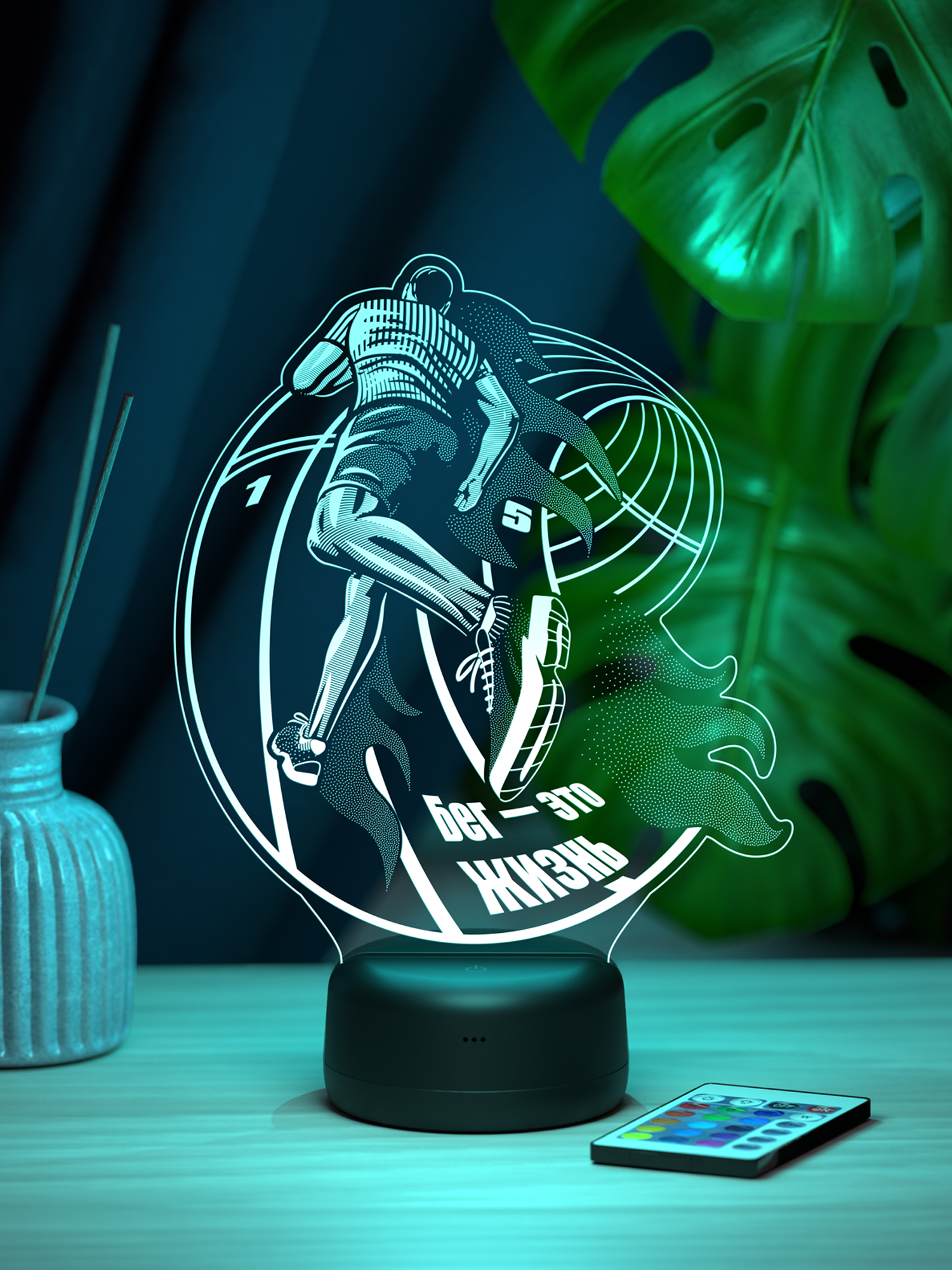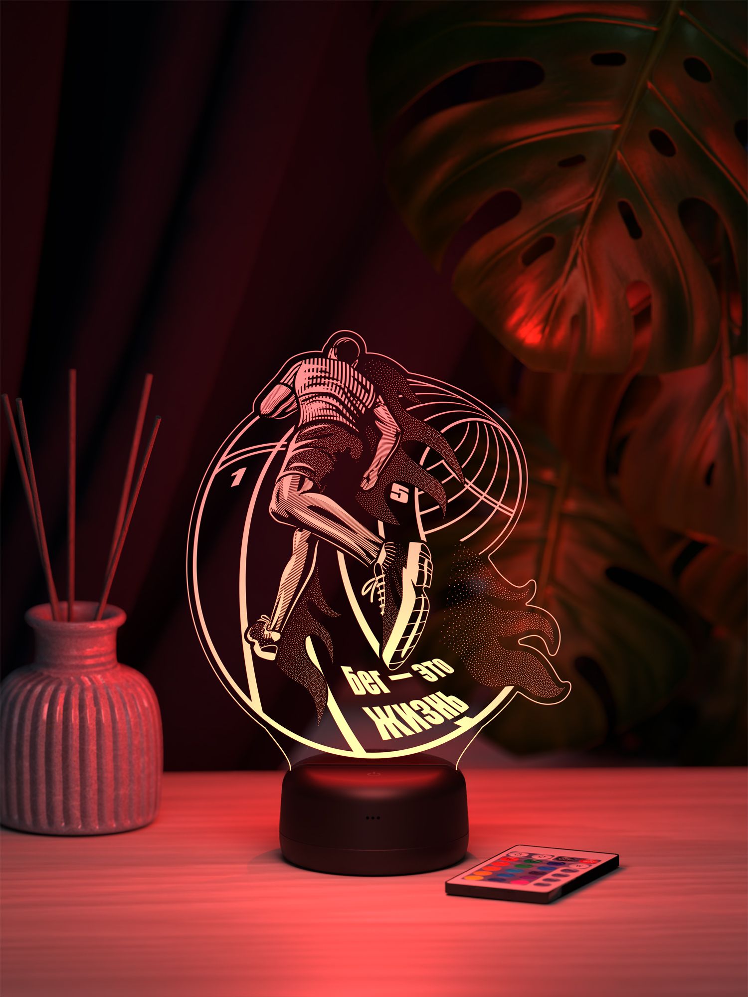 Представляем вашему вниманию ночник, вдохновленный динамикой и энергией движения. На его поверхности гордо красуется мотивирующая надпись «Бег - это жизнь», делая его больше, чем просто источником света. Этот ночник станет превосходным подарком для юных спортсменов, для детей, увлеченных активным образом жизни, а также для взрослых, которые ценят движение и стремление к цели. Он будет уместен как по случаю спортивных достижений, так и как символ вдохновения на каждый день, прекрасно дополняя интерьер комнаты спортсмена, детской или подростковой спальни.