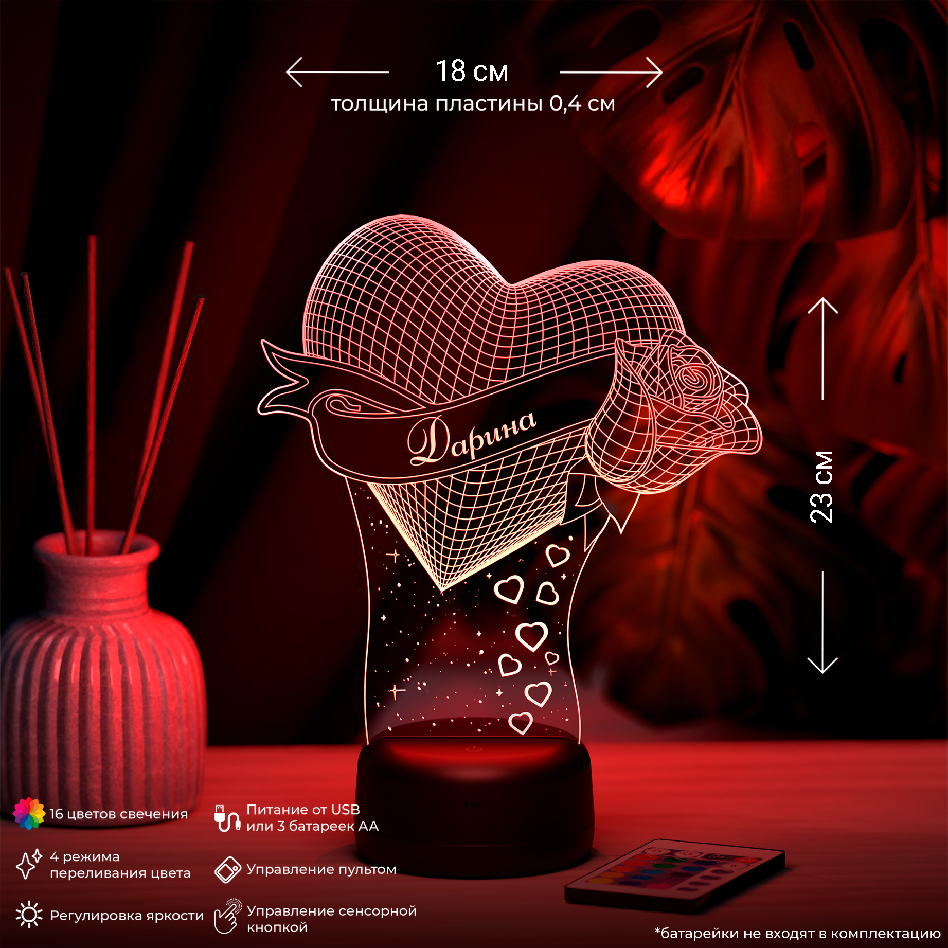 В светильнике 16 цветов свечения и режим плавной смены цвета. Цвета переключаются сенсорной кнопкой. Сенсорный выключатель находится в верхней части подставки. Радиус освещения в пределах 2-х метров. Материал: -органическое стекло -база из ABS пластика