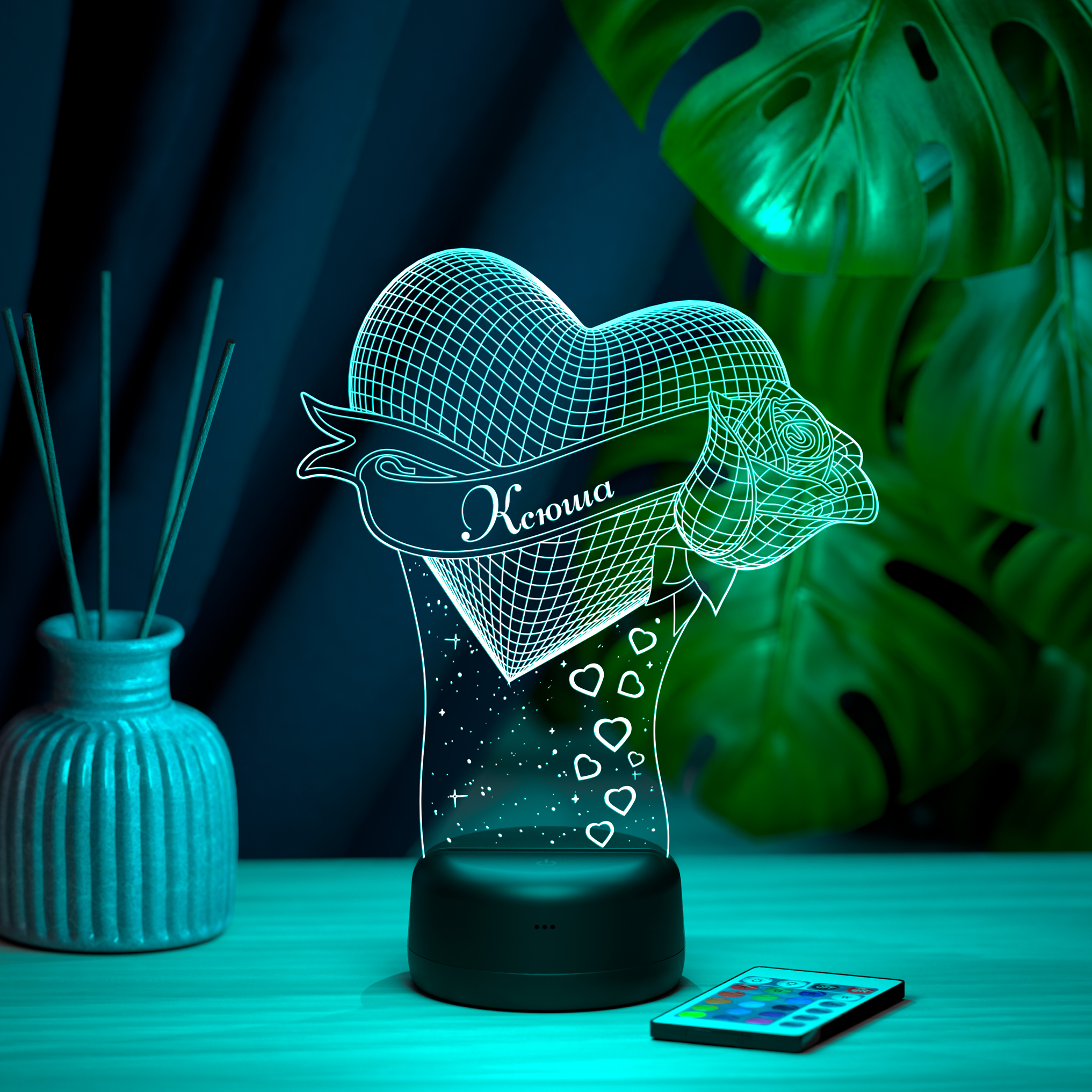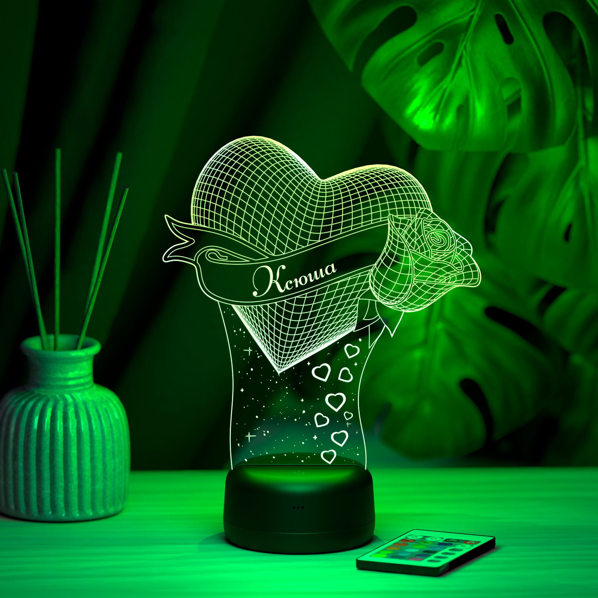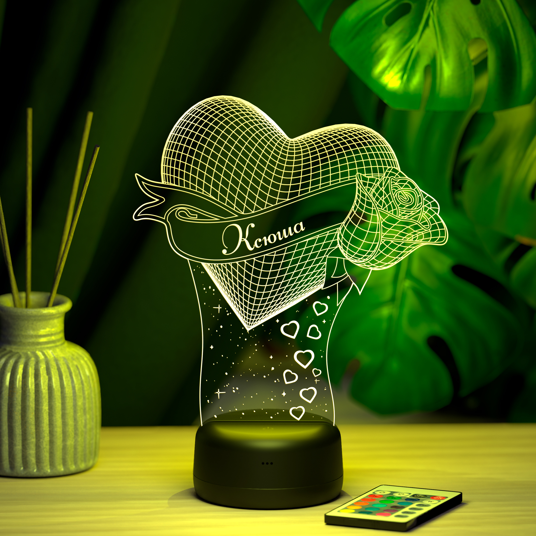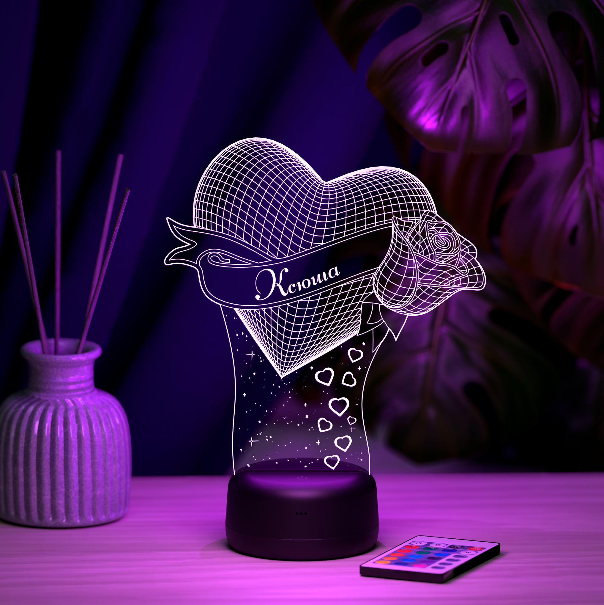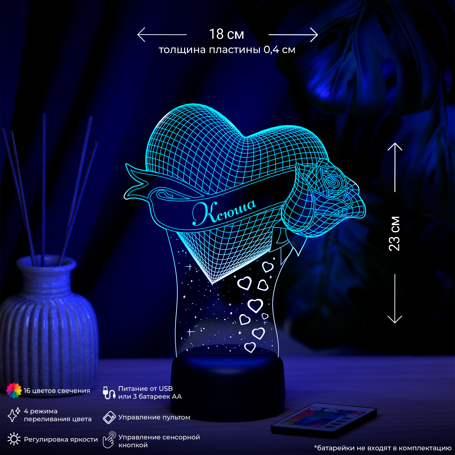 Ночник "Сердце с розой с именем Ксюша" — это отличный способ создать уютную атмосферу в вашем интерьере. Этот ночник станет замечательным подарком для девушки, сестры, подруги, дочери или коллеги по имени Ксюша. С его помощью вы подчеркнете индивидуальность человека, которому он предназначен.