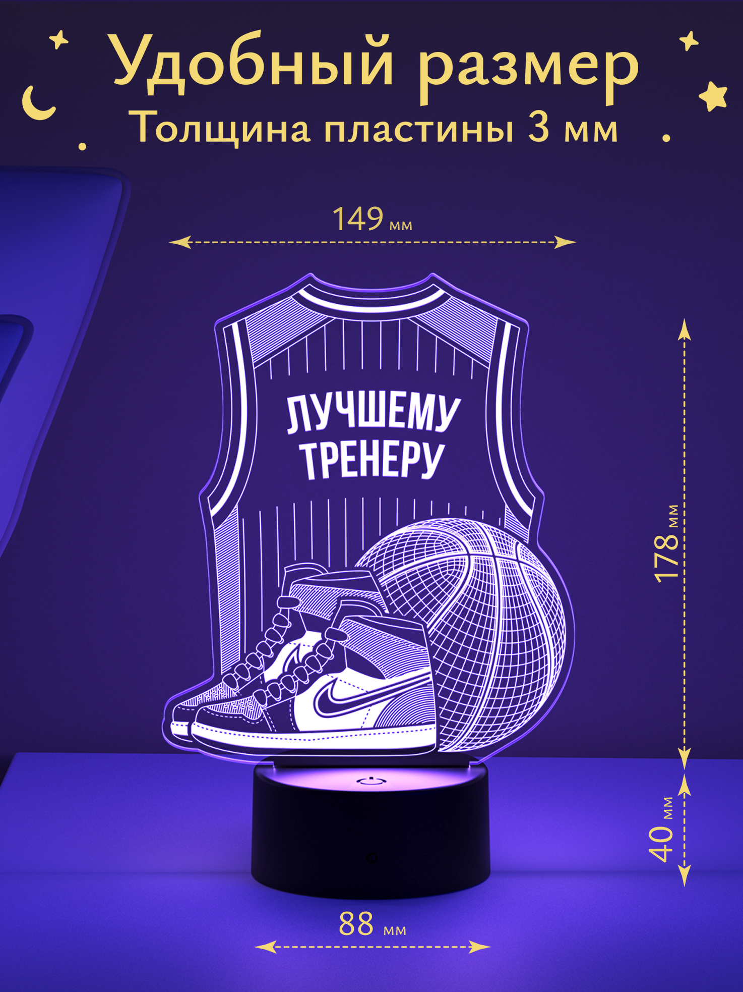 Ночник «Баскетбольная форма тренеру» - это не просто источник света. Это атмосфера благодарности, командной сплочённости и вдохновения, которая мягким свечением наполняет интерьер теплом и гордостью за совместные победы.