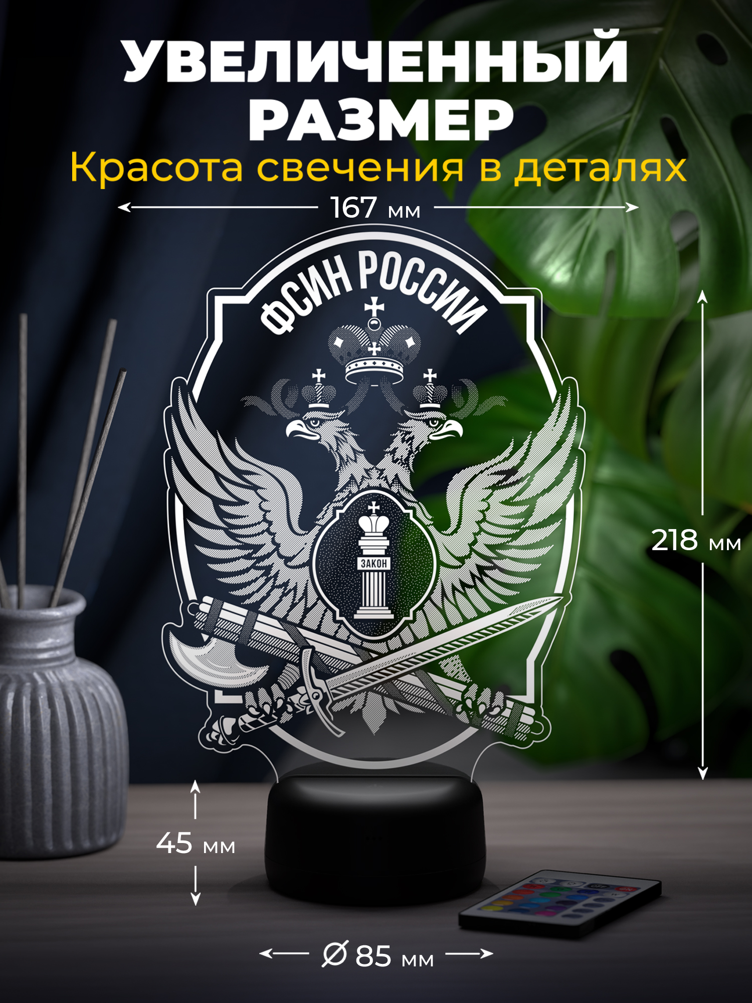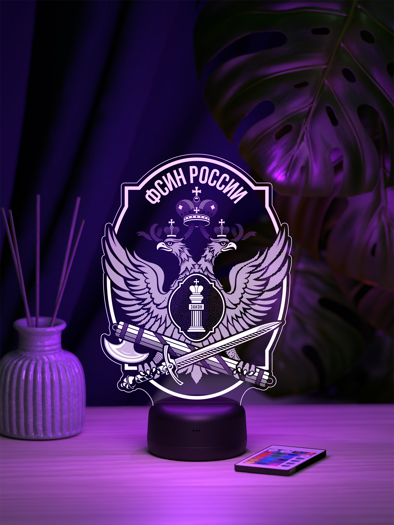 Ночник «ФСИН» подчёркивает силу служебного духа, дисциплину и уважение к выбранному пути. Строгая тематическая символика эффектно подсвечивается, а мягкое свечение формирует сдержанную и уверенную атмосферу, гармонично дополняя интерьер кабинета или жилого пространства. Высокое качество рисунка делает изображение чётким и выразительным, а качественные материалы обеспечивают аккуратный внешний вид и надёжность исполнения.